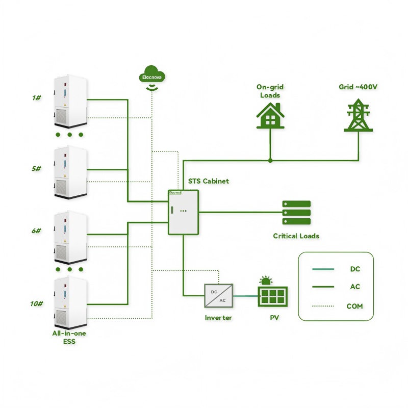 The Sailsolar All-in-One ESS is a 1MW/2.3MWh integrated system for commercial and industrial self-consumption, combining solar generation with Li-ion battery storage. Its core component, the SAS-BESS-P261 cabinet, integrates battery packs, BMS and bi-directional PCS for compact deployment. The system maximizes solar self-use, performs peak shaving and grid arbitrage, and ensures ≤20ms backup switching for critical loads. The configuration includes 10 SAS-BESS-P261 units and a 1MW STS cabinet, offering a scalable turnkey solution for reducing energy costs and ensuring power reliability.